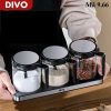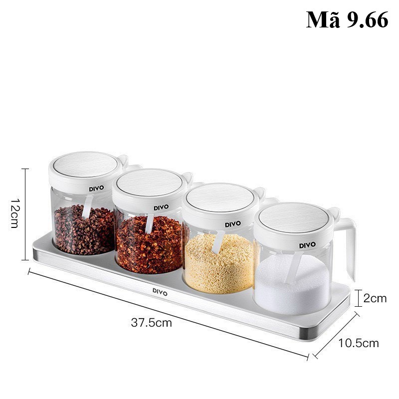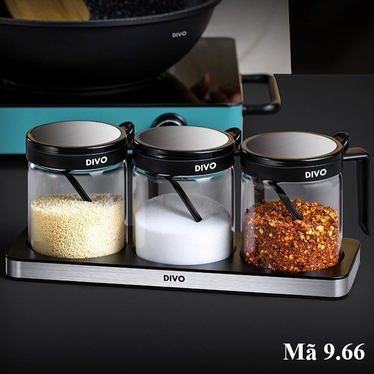Set hũ gia vị thủy tinh + khay inox nhựa DIVO 9.66