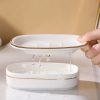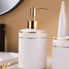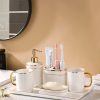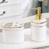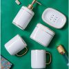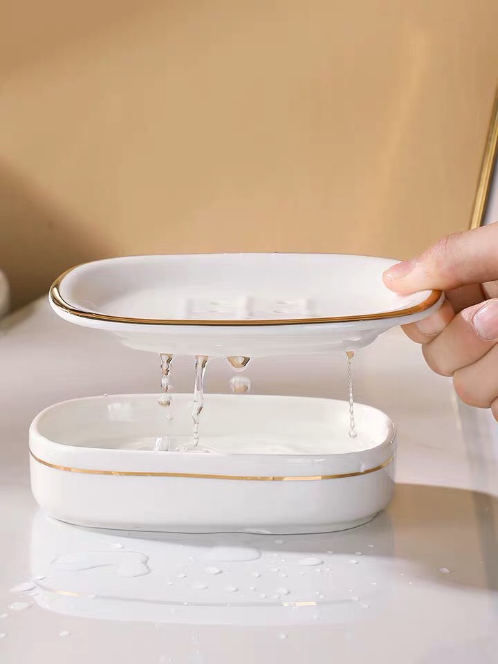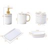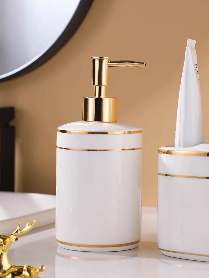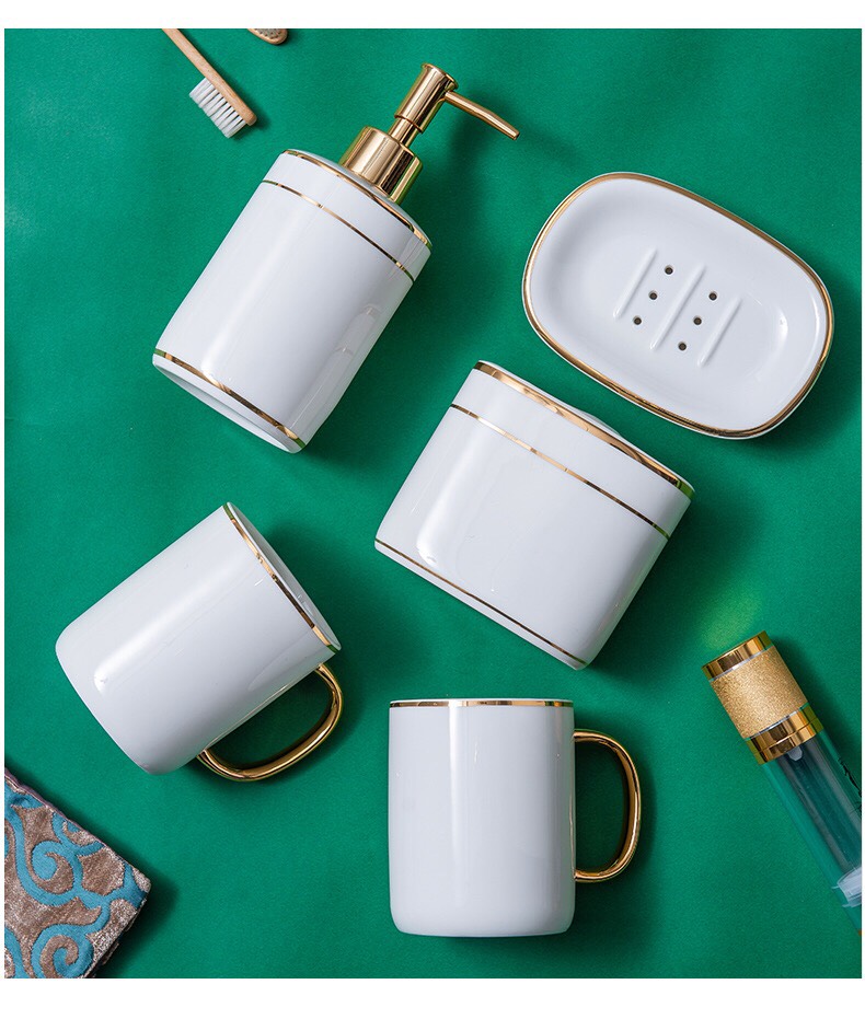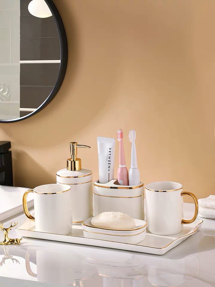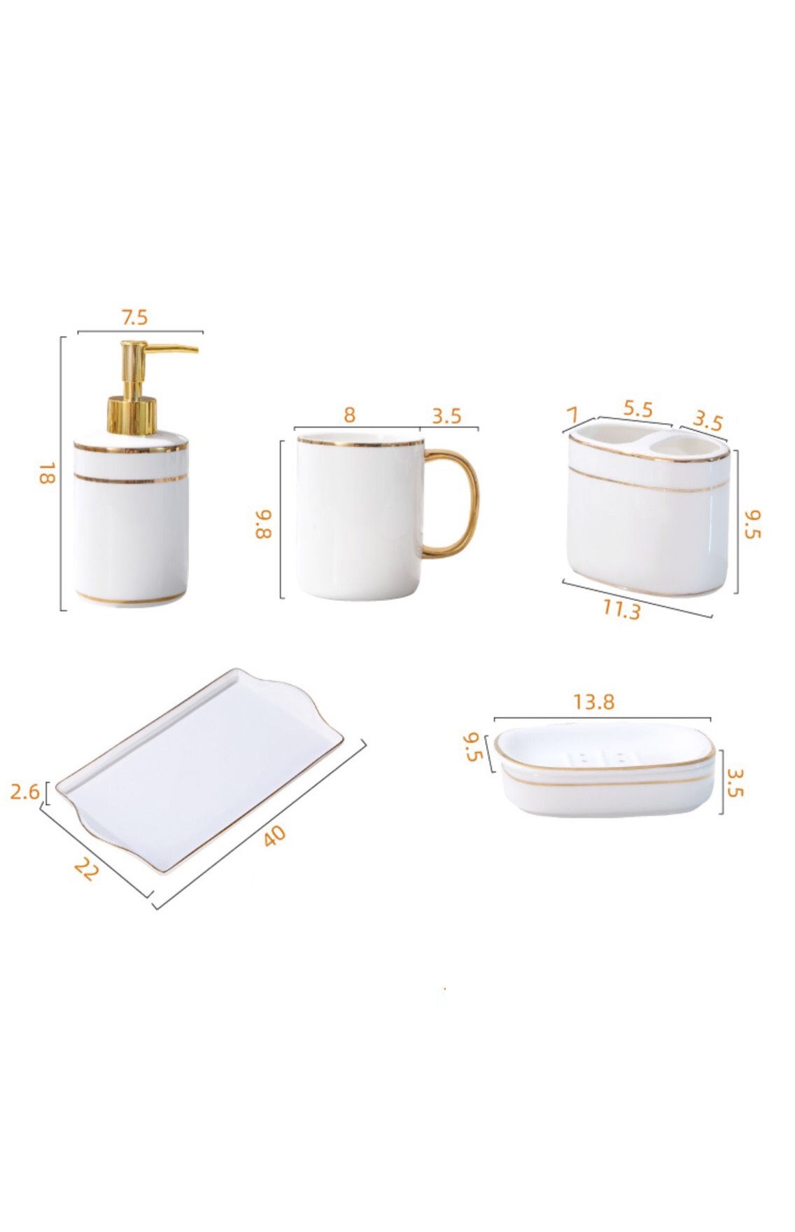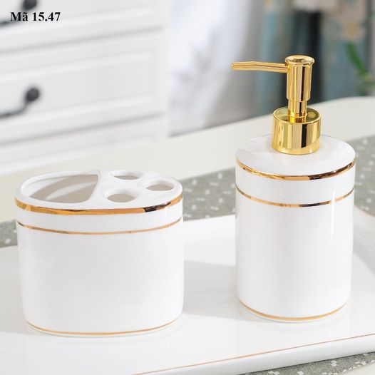 Một bộ gồm: 1 chai dầu, 2 cốc xúc miệng, 1 cốc đựng bàn chải, 1 khay đựng xà phòng và 1 khay sứ trắng.