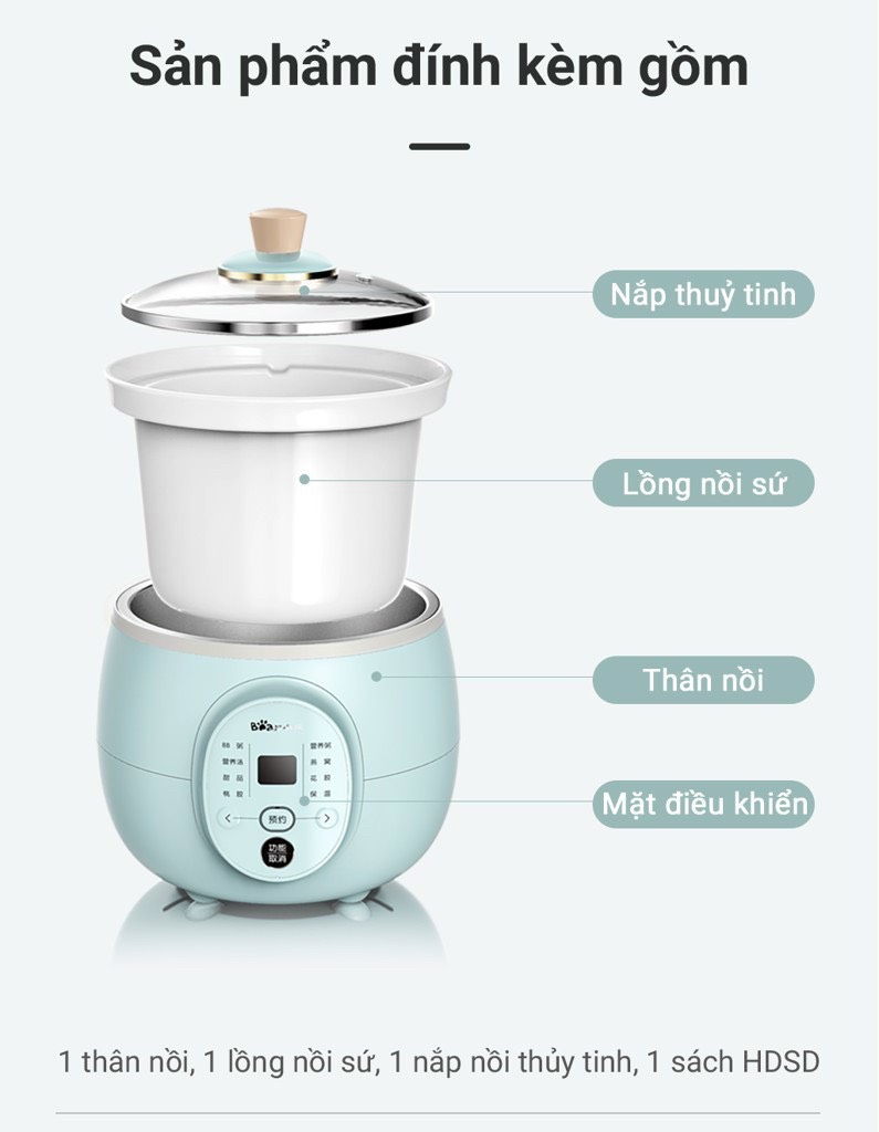– Sản phẩm gồm có 1 thân nồi, 1 lồng nồi sứ, 1 nắp nồi thủy tinh và 1 sách HDSD.
