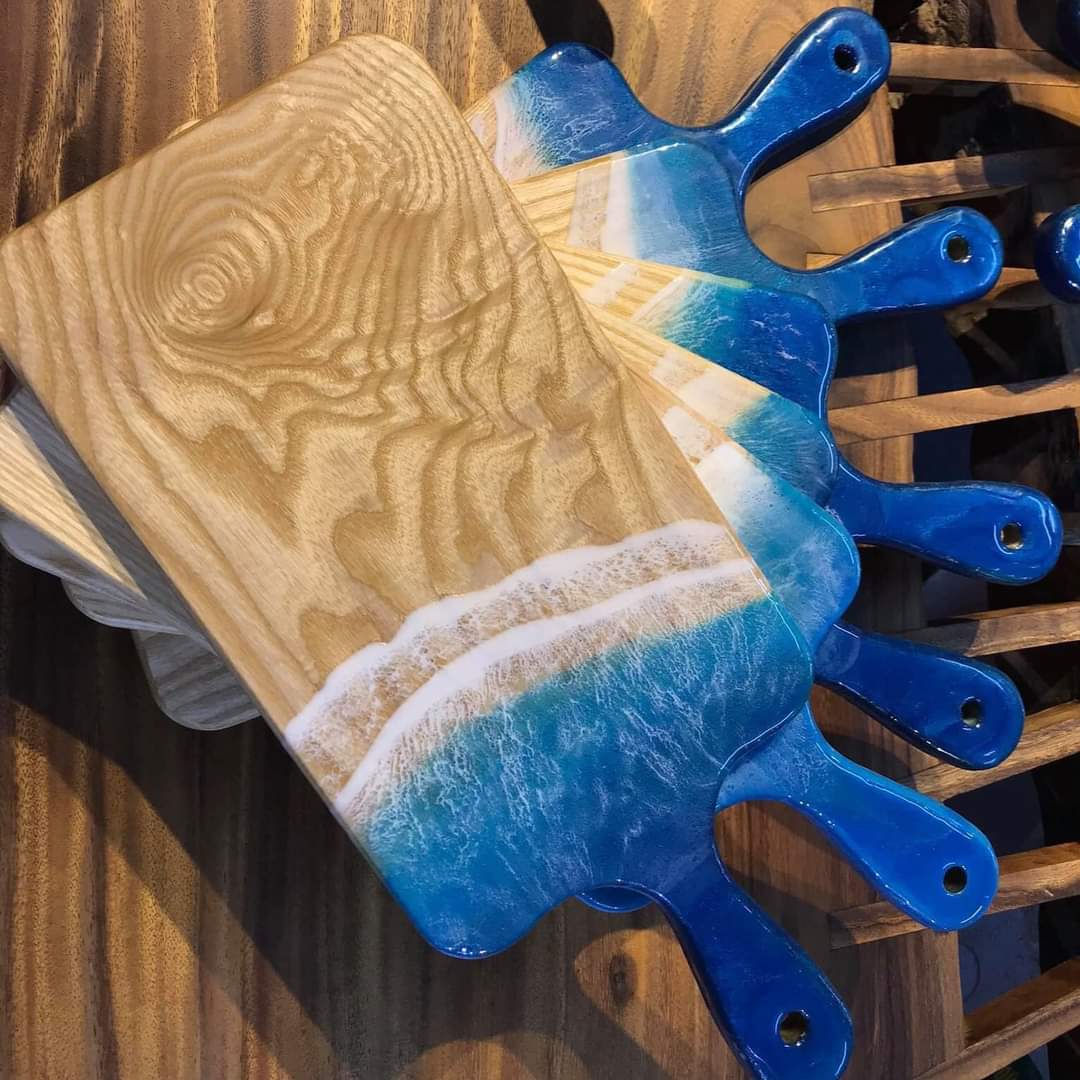 – Chất liệu: Thớt chất liệu gỗ thông, phần sóng biển được vẽ thủ công bằng màu chuyên dụng và keo epoxy resin, bề mặt có lau dầu bóng của Bỉ, nên an toàn khi dùng để đựng thực phẩm ạ. Hàng thủ công 100% được làm tại Việt Nam.